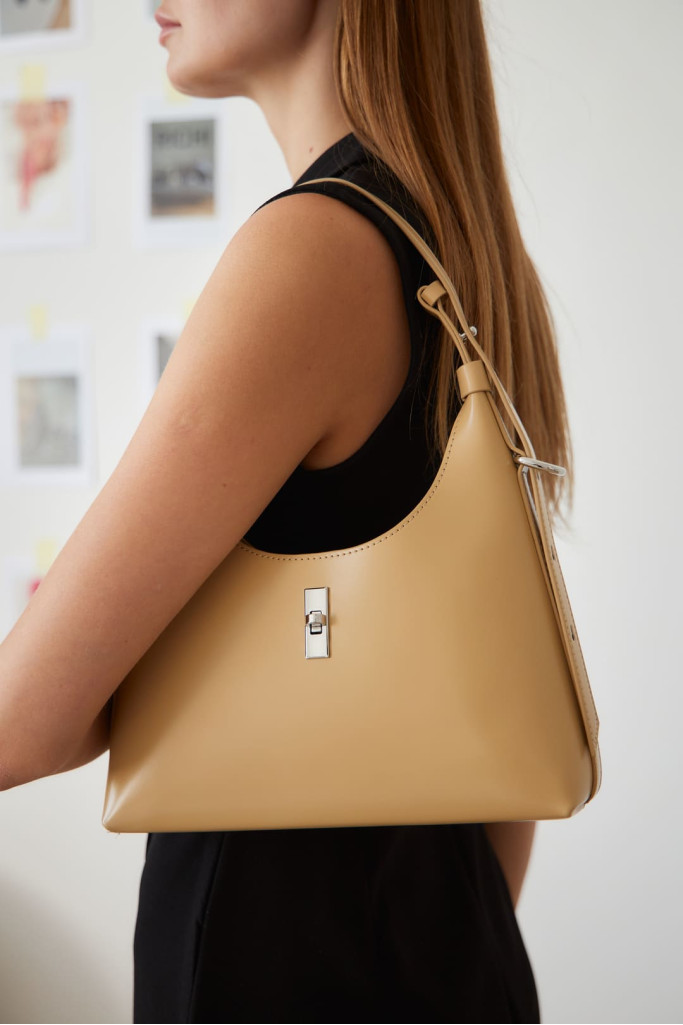Сумка1984A изготовлена из высококачественной натуральной кожи бежевого цвета. Плечевой ремень, металлическая фурнитура, кожаная подкладка - все эти детали придают сумке особый шарм и функциональность. Плечевой ремень делает сумку удобной в повседневном использовании. Эта сумка действительно может стать отличным дополнением к различным нарядам.