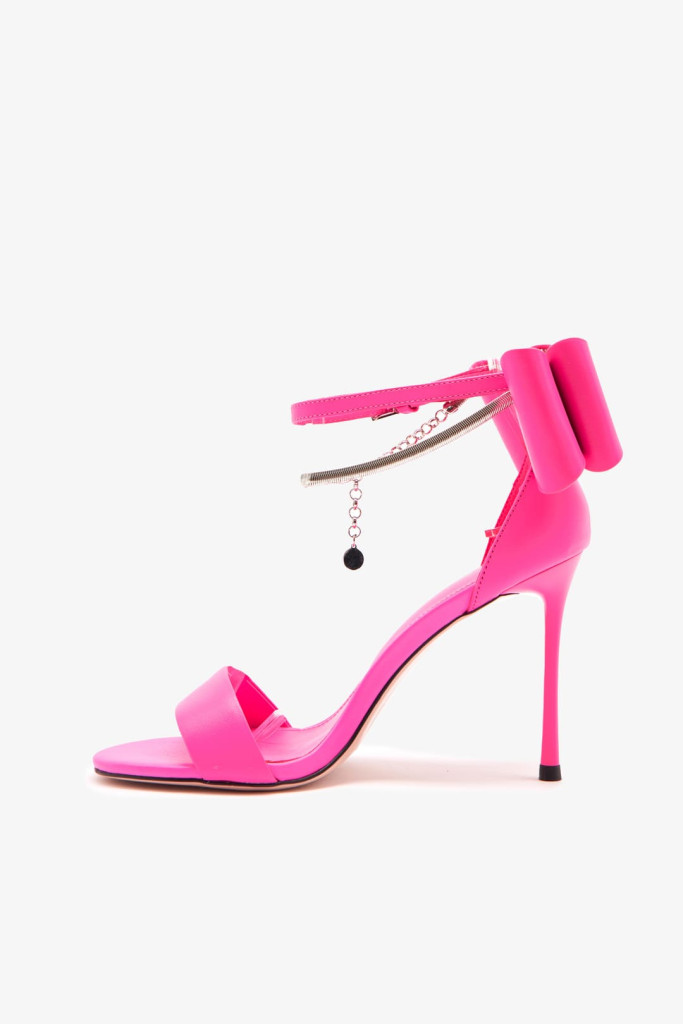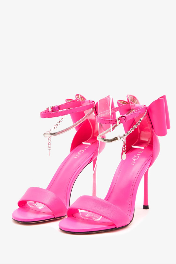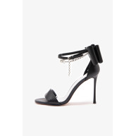 Закрытая пятка, декоративный бант со стразами в пяточной части, металлическая цепь на щиколотке, а также открытый мыс, придают обуви особый шарм, а устойчивый каблук-шпилька обеспечивает удобство при ходьбе. Натуральная кожа и стелька из натуральной кожи обещают долговечность и комфорт.