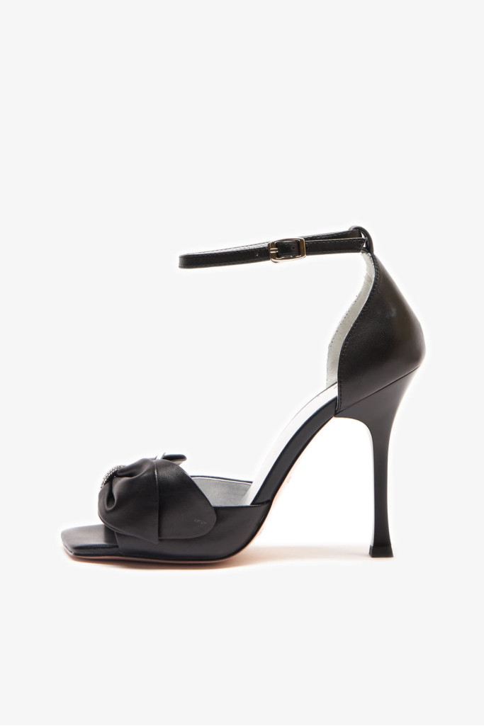 Закрытая пятка и открытый мыс, а также декор в виде банта и декоративный элемент со стразами придают этой модели особый шарм и утонченность. Устойчивый каблук-шпилька обеспечивает удобство при ходьбе, делая эту обувь универсальной для различных образов.
