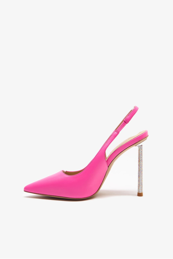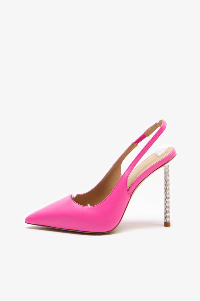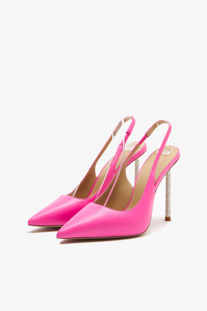 Открытая пятка и закрытый заостренный мыс  придают этой модели особый шарм и утонченность. Оригинальный каблук-шпилька украшен декором в виде страз, обеспечивает удобство при ходьбе, делая эту обувь универсальной для различных образов.