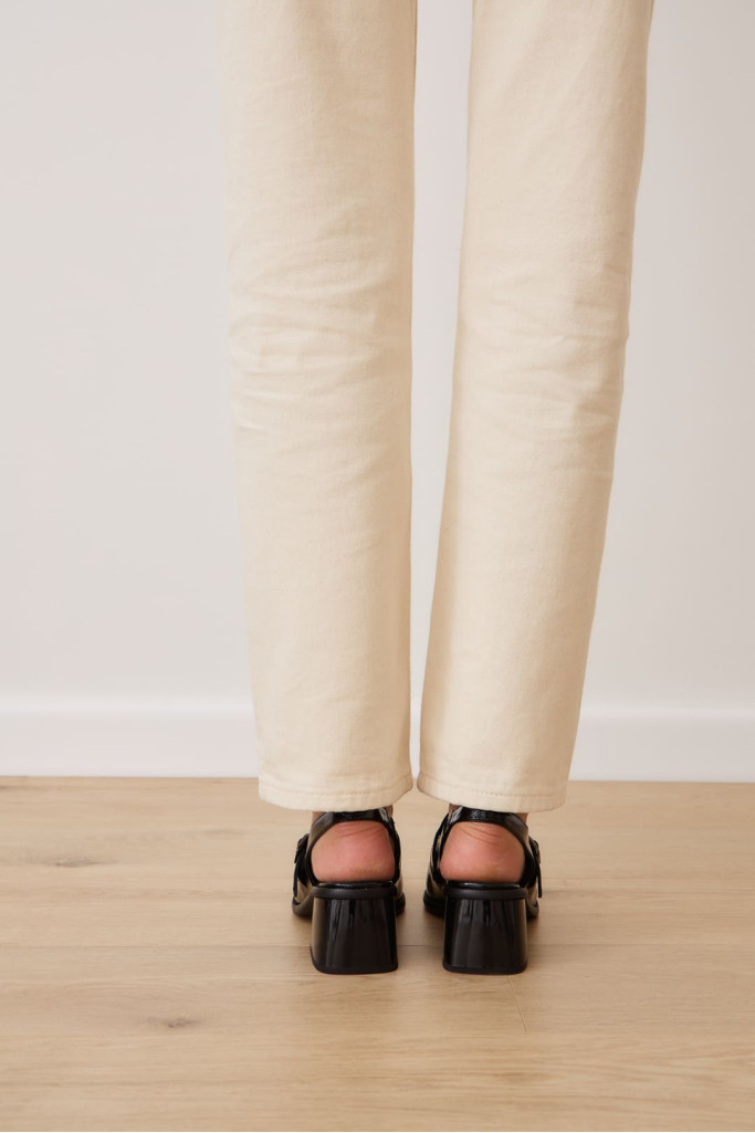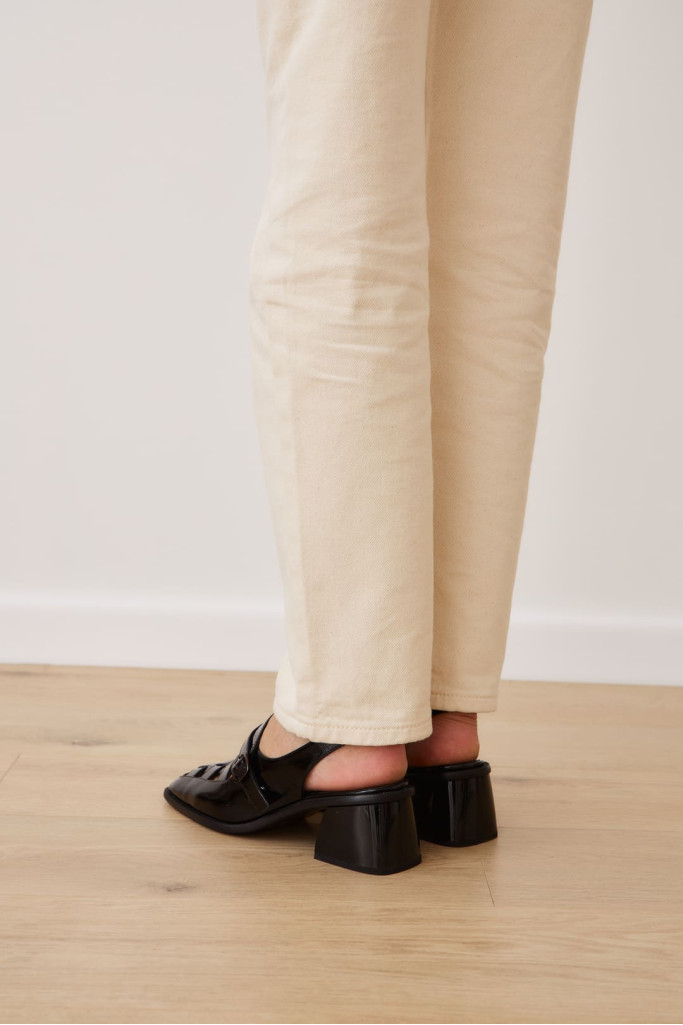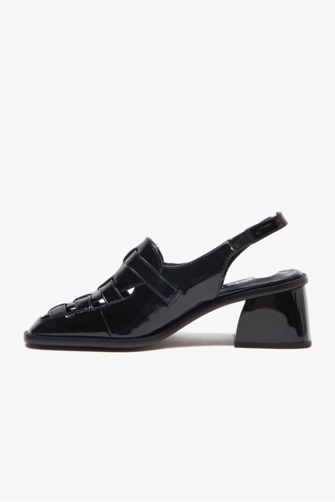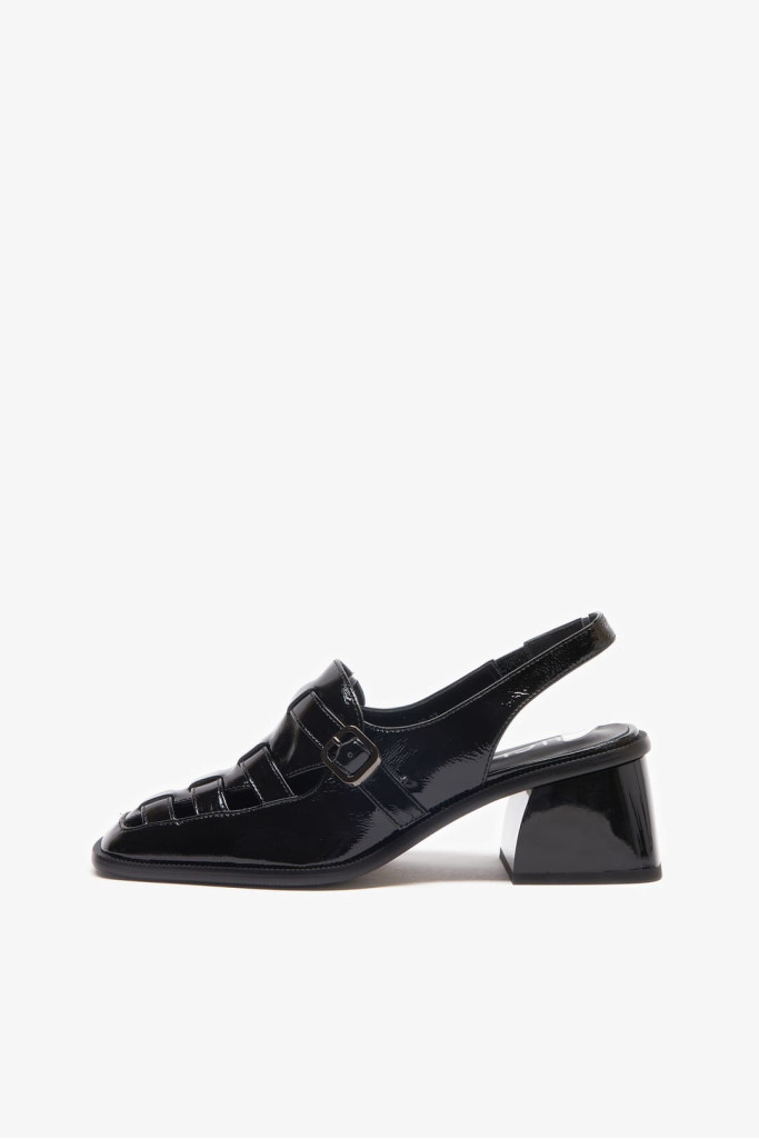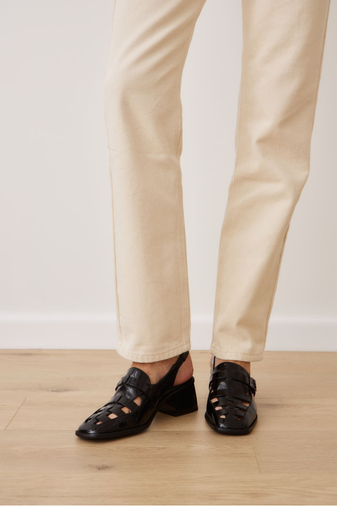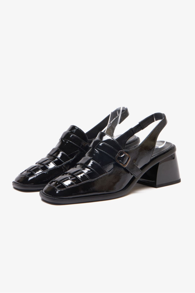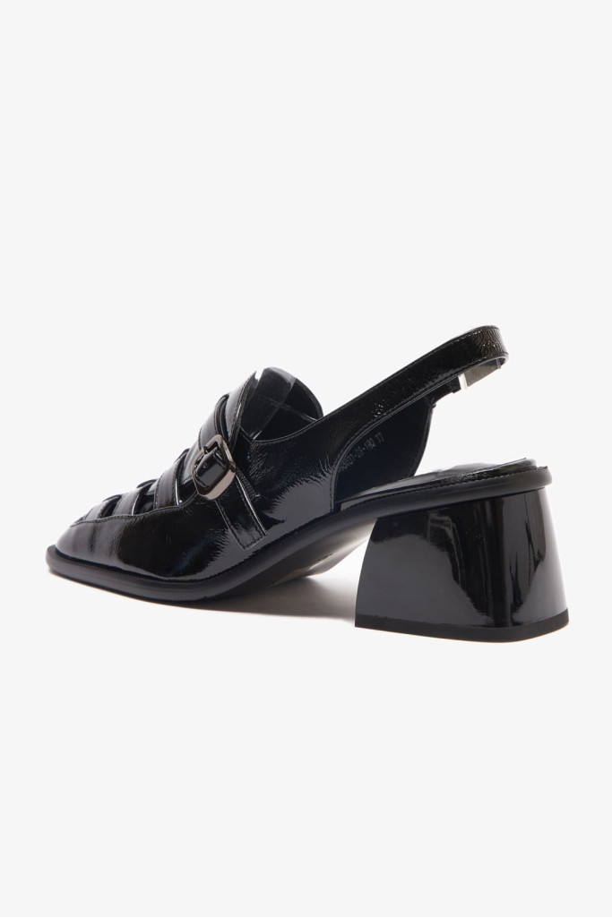 Открытая пятка и закрытый мыс придают этой модели особый шарм и утонченность. Широкий устойчивый каблук обеспечивает удобство при ходьбе, делая эту обувь универсальной для различных образов.