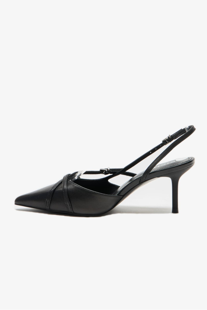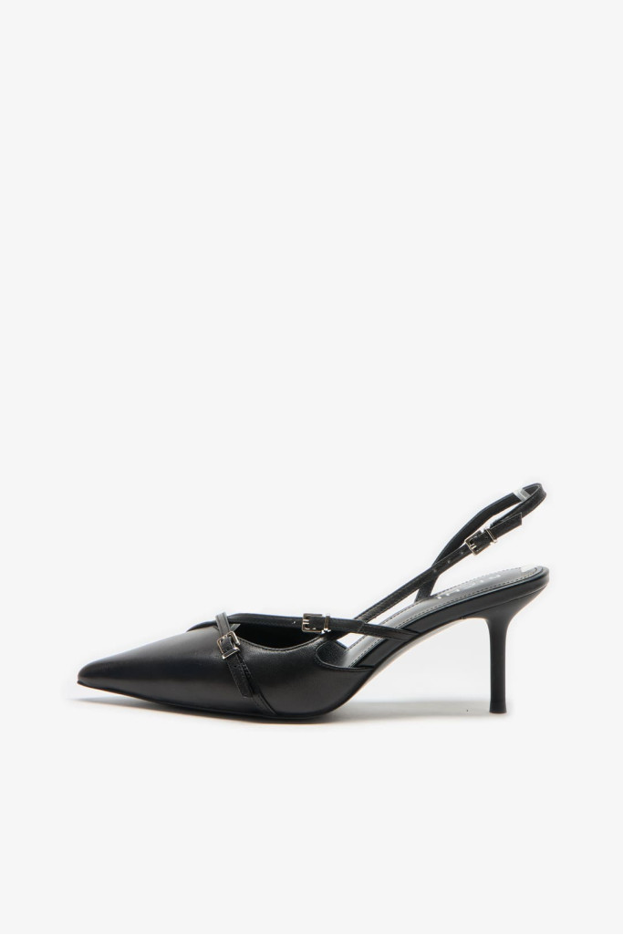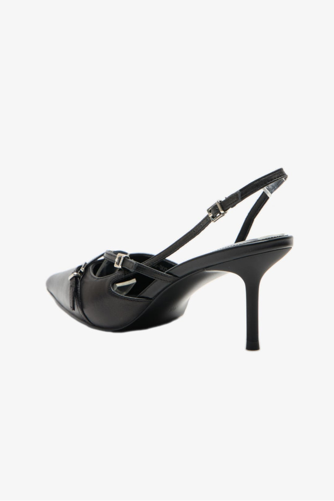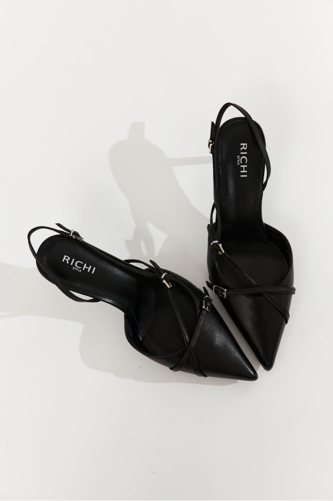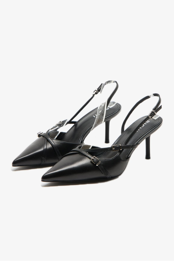 Открытая пятка, закрытый заостренный мыс c декором в виде ремешков и ремешок с застежкой на щиколотке придают этой модели особый шарм и утонченность. Каблук-шпилька обеспечивает удобство при ходьбе, делая эту обувь универсальной для различных образов.