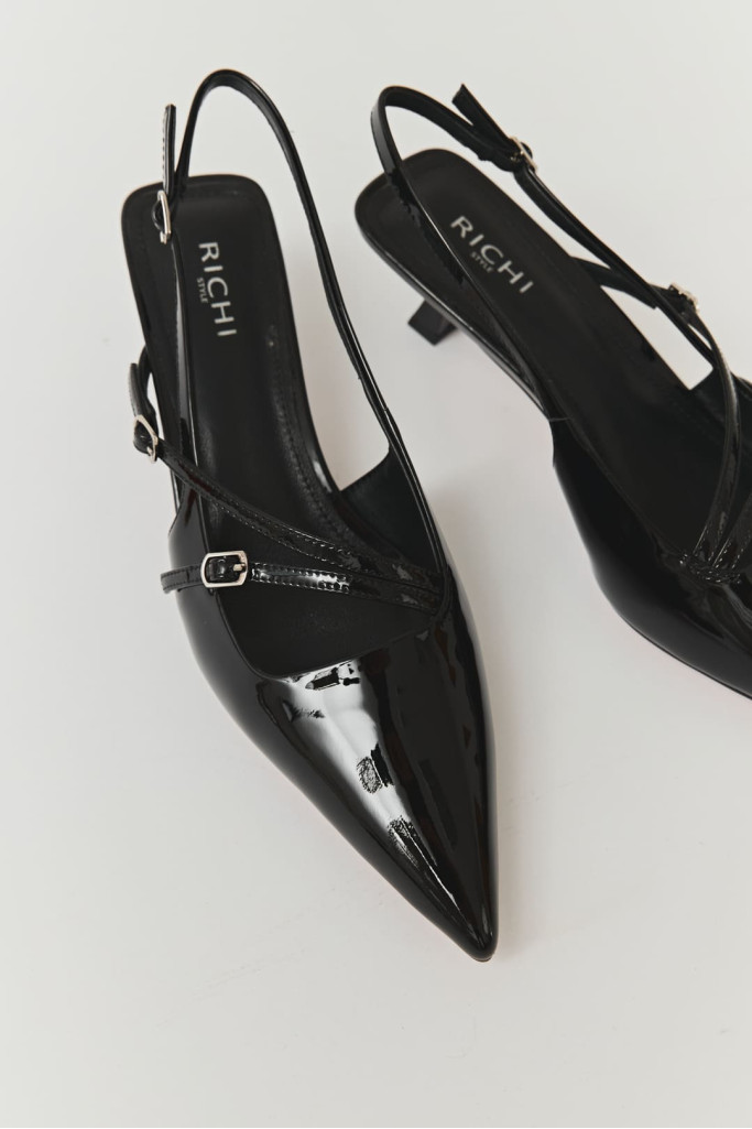 Открытая пятка, закрытый заостренный мыс c декором в виде ремешков и ремешок с застежкой на щиколотке придают этой модели особый шарм и утонченность. Каблук-рюмочка обеспечивает удобство при ходьбе, делая эту обувь универсальной для различных образов.
