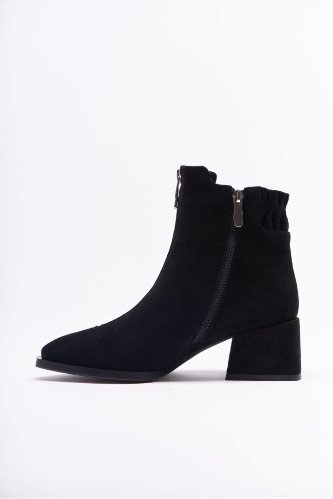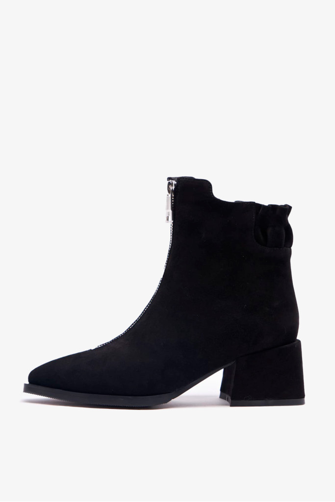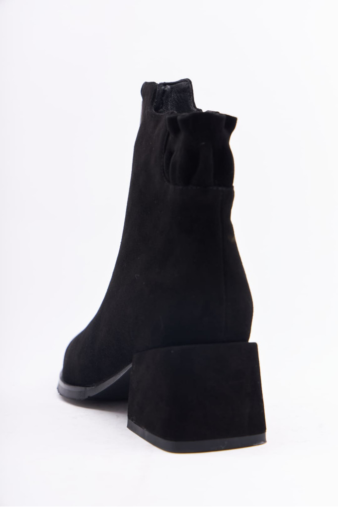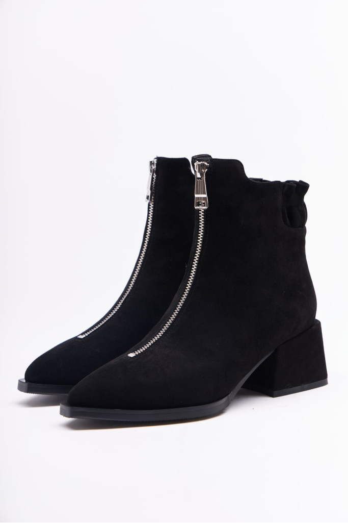 Ботильоны 1034 - это стильная и эффектная модель, выполненная из натуральной замши в черном цвете. Ботильоны имеют острые мыс, что добавляет им модный акцент, а также декоративную молнию на подъёме, придающую оригинальность модели. Особенностью этих ботильонов является широкий и устойчивый каблук, который обеспечивает комфорт при ходьбе.