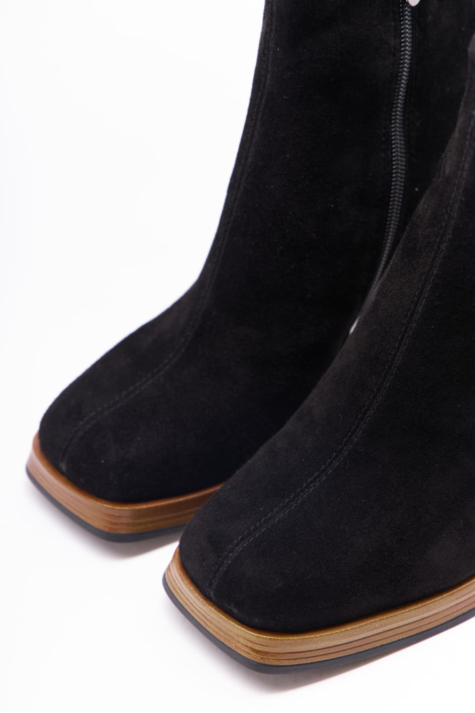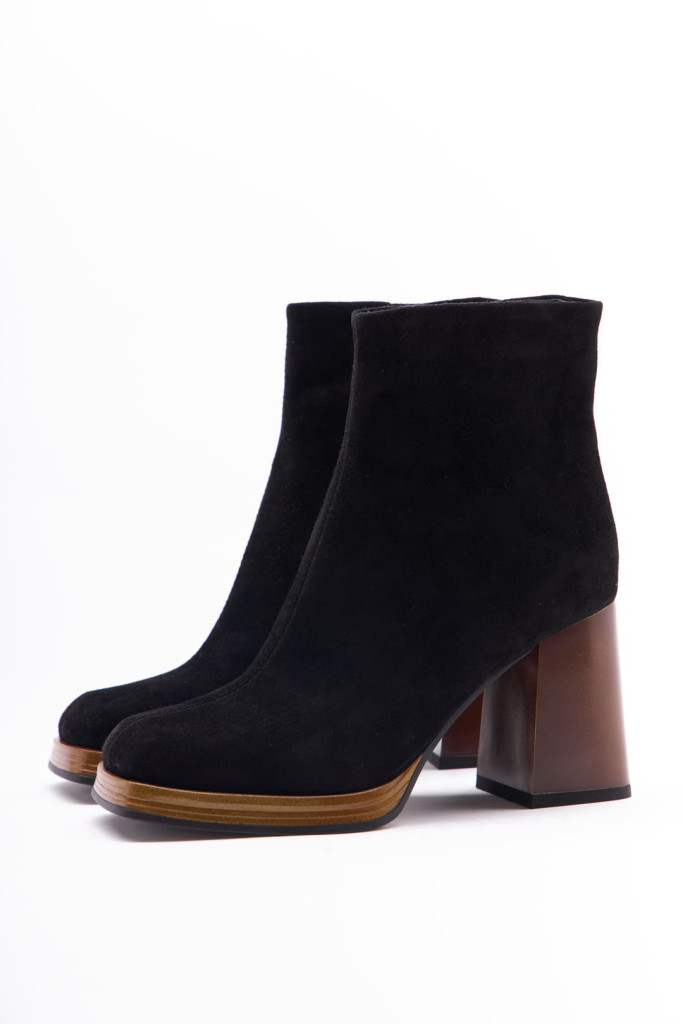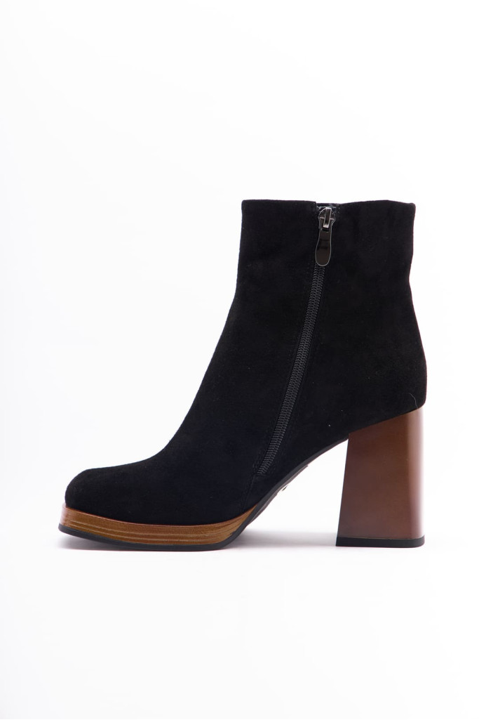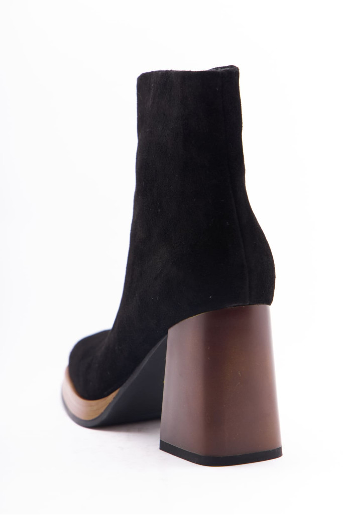 Ботильоны 1197 - отличный выбор для тех, кто ценит стиль, комфорт и качество. Натуральная замша в чёрном цвете придает им модный и элегантный вид. Прямоугольный мыс и замочек с внутренней стороны, широкий и устойчивый каблук добавляют дополнительный стильный акцент, привлекая внимание окружающих.