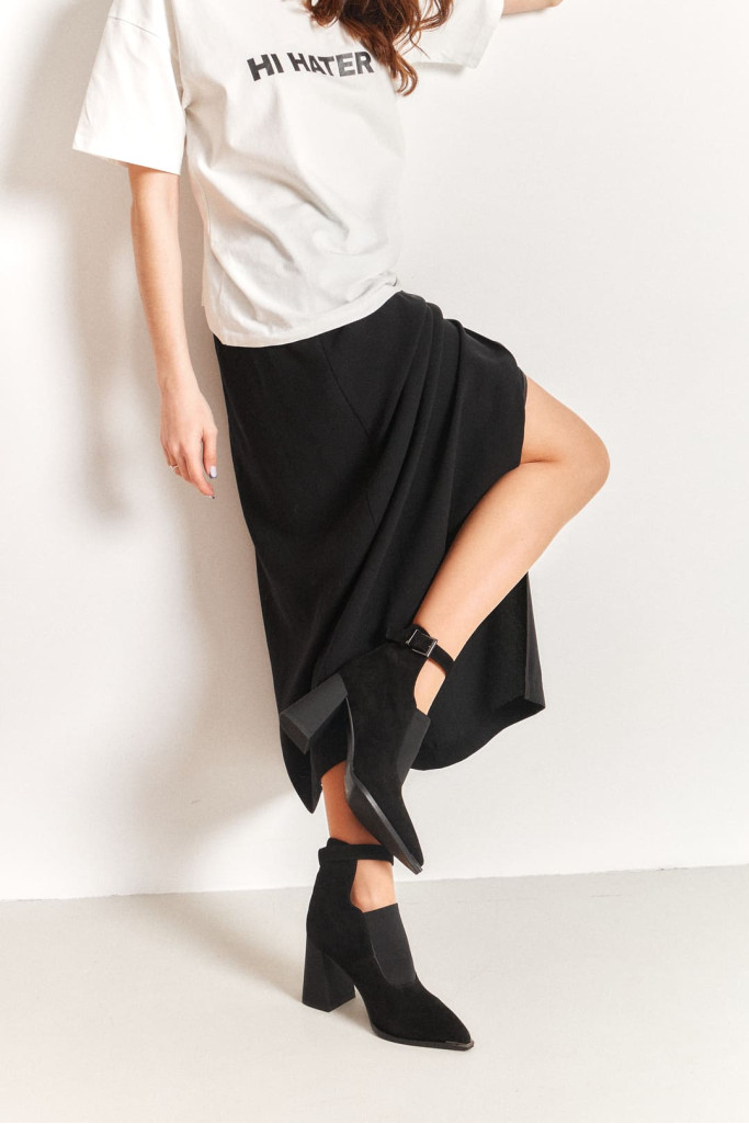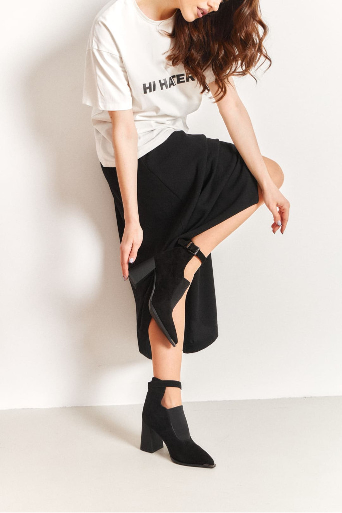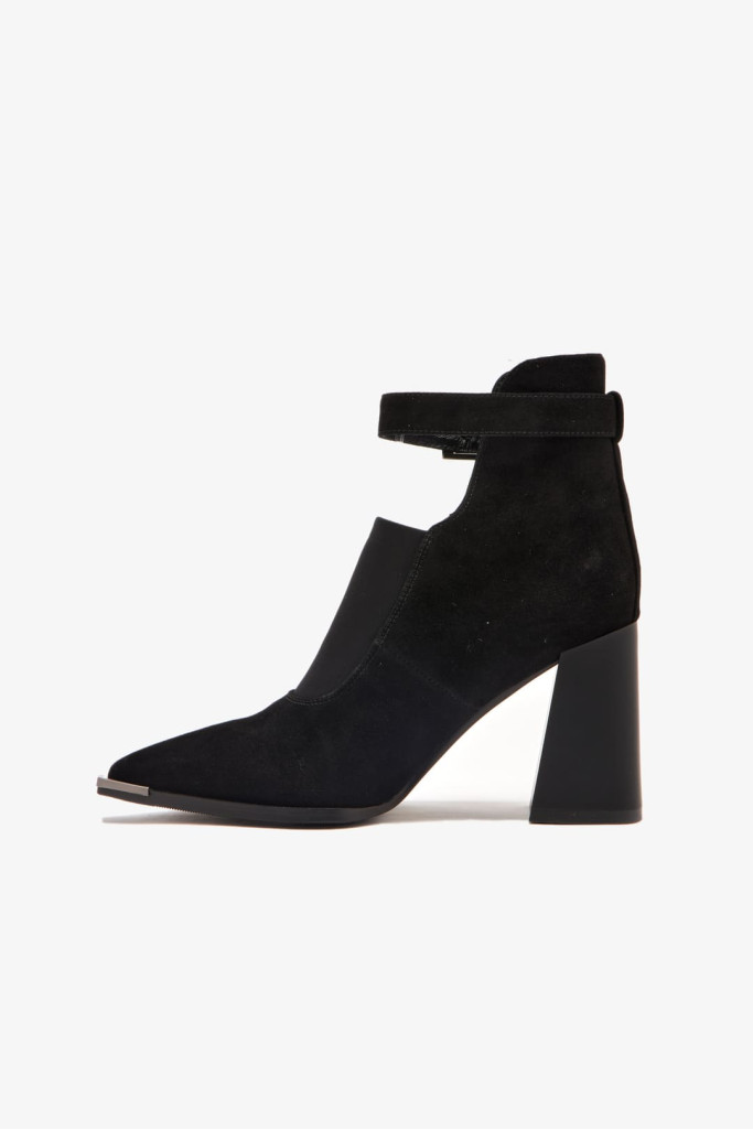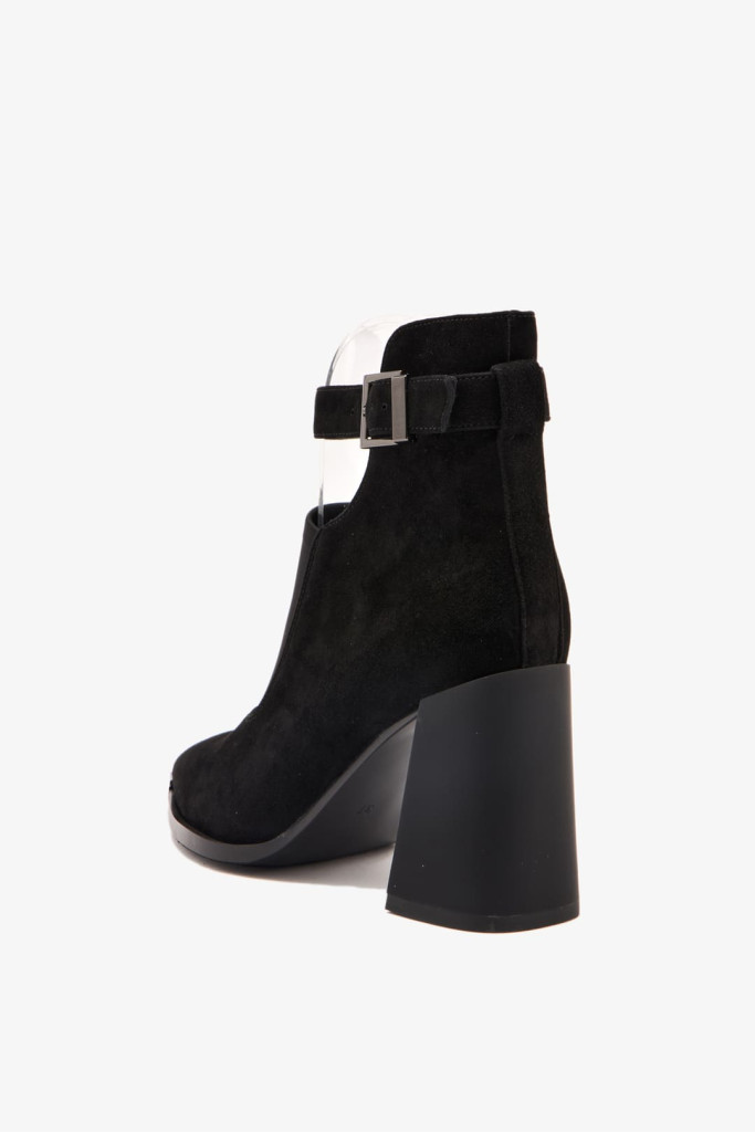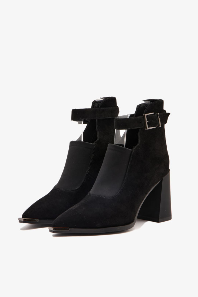 Ботильоны 1590 из натуральной замши черного цвета - это изысканный и стильный выбор для любой женщины. Их устойчивый каблук, эластичная вставка на подъеме и удобная застежка на ремешок с пряжкой делают их не только модными, но и практичными для повседневного использования.