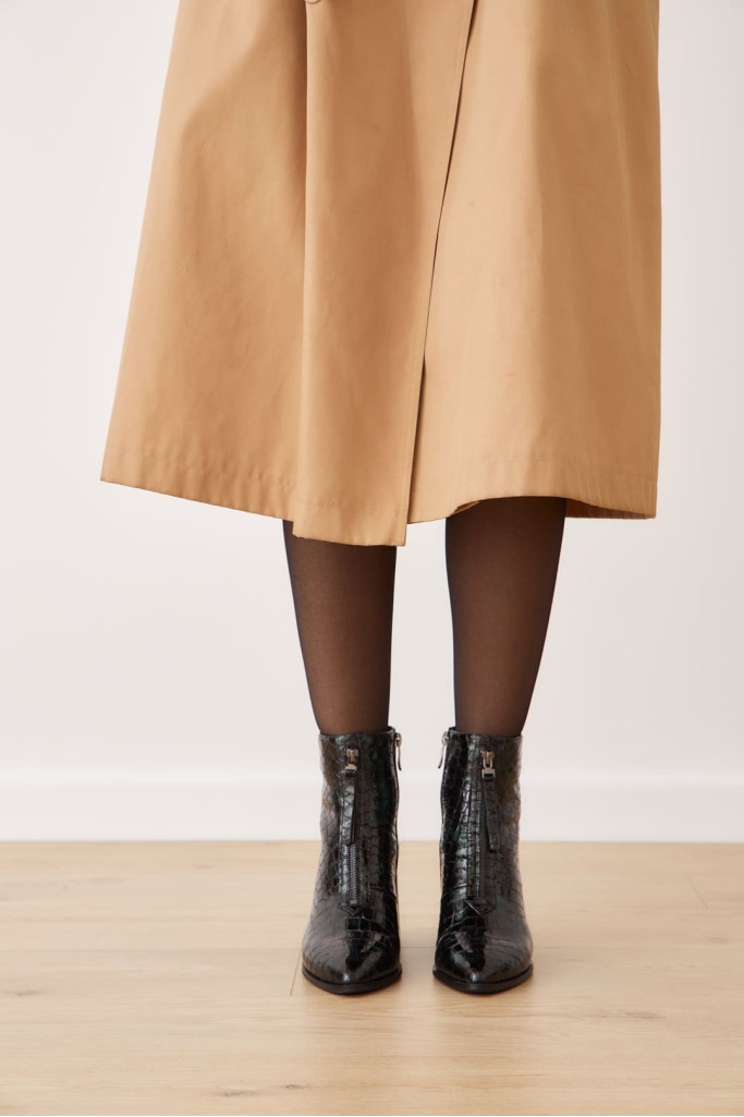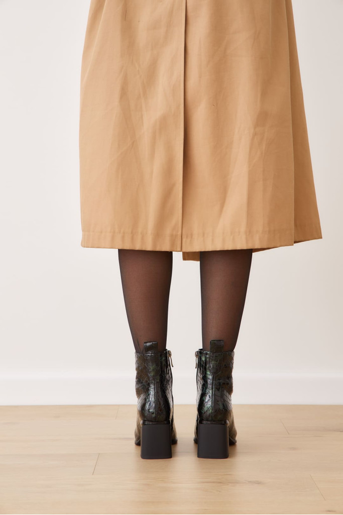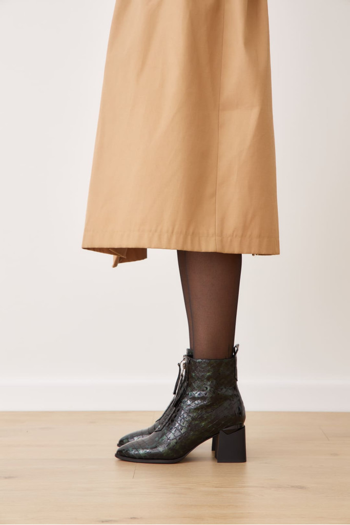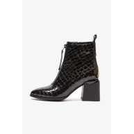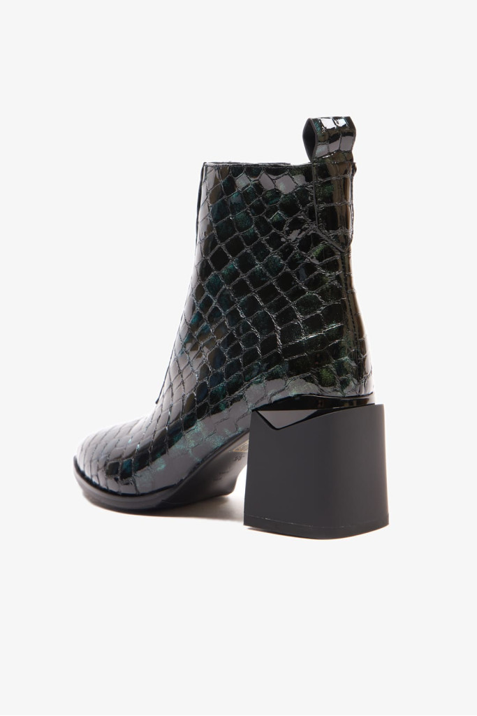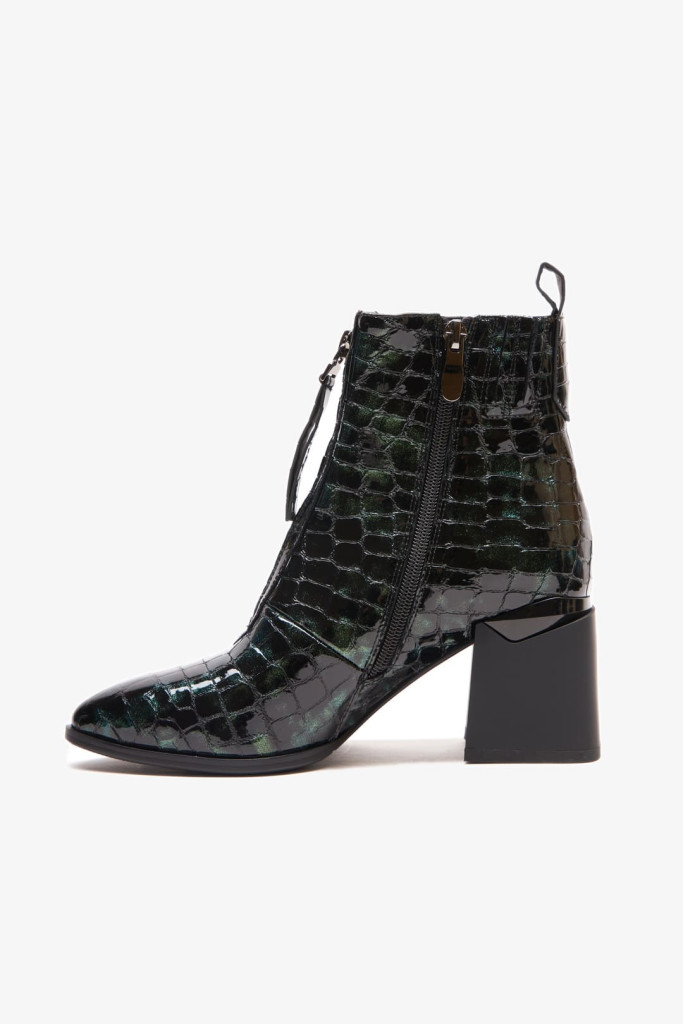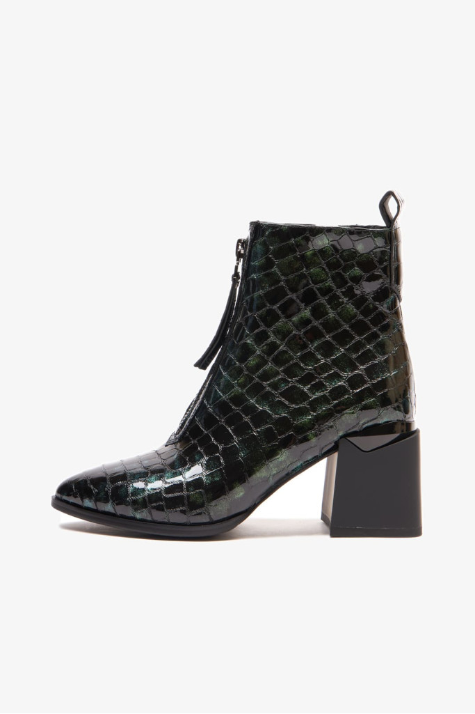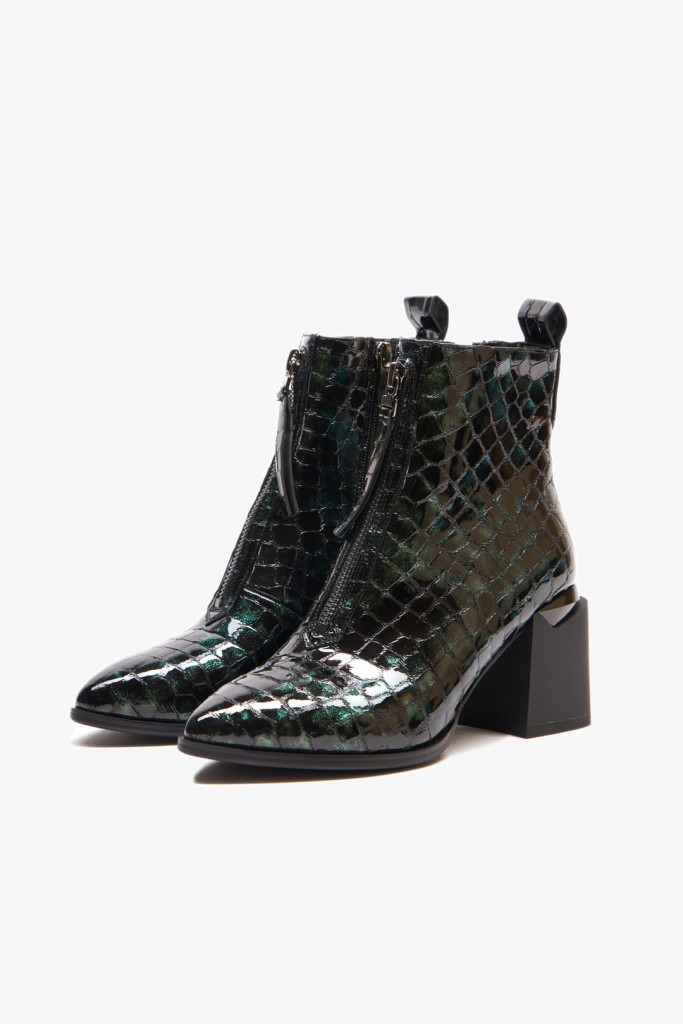 Ботильоны 2056E – это идеальное дополнение к вашей коллекции стильной демисезонной обуви. Изготовленные из качественной натуральной лаковой кожи с фактурой под рептилию зеленого цвета, эти ботильоны выделяются продуманным дизайном, включая заостренный мыс, декоративную молнию на подъеме, застежку на молнию с внутренней стороны и широкий устойчивый каблук. Каждая деталь великолепно сочетается, создавая утонченный образ.