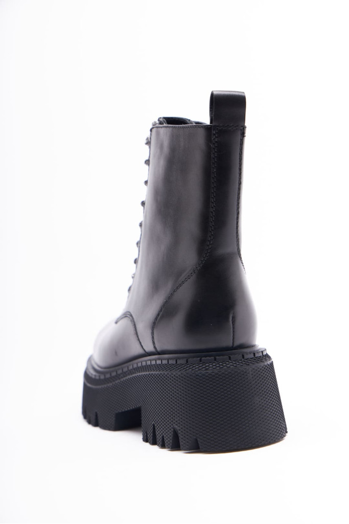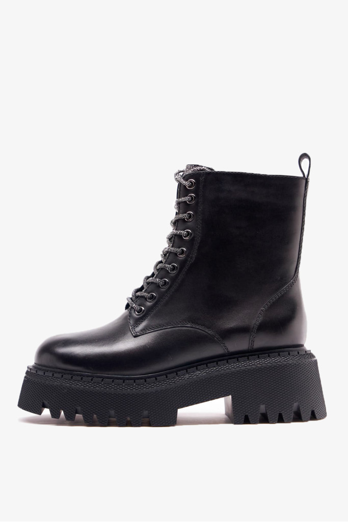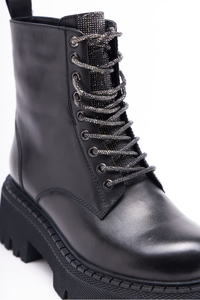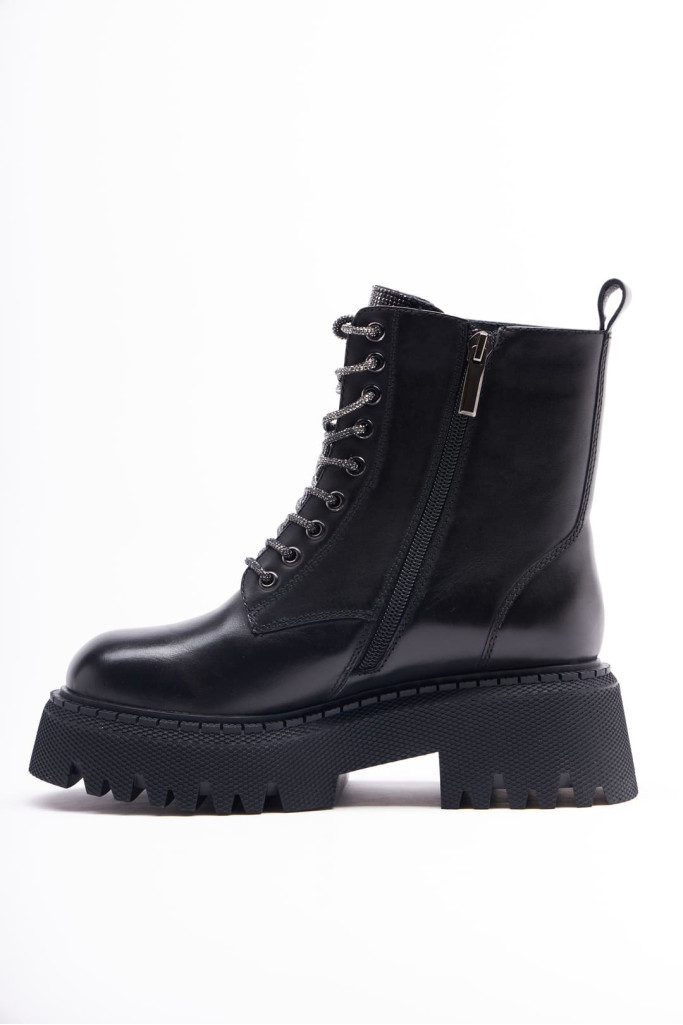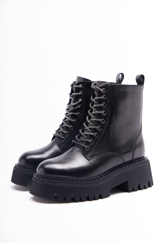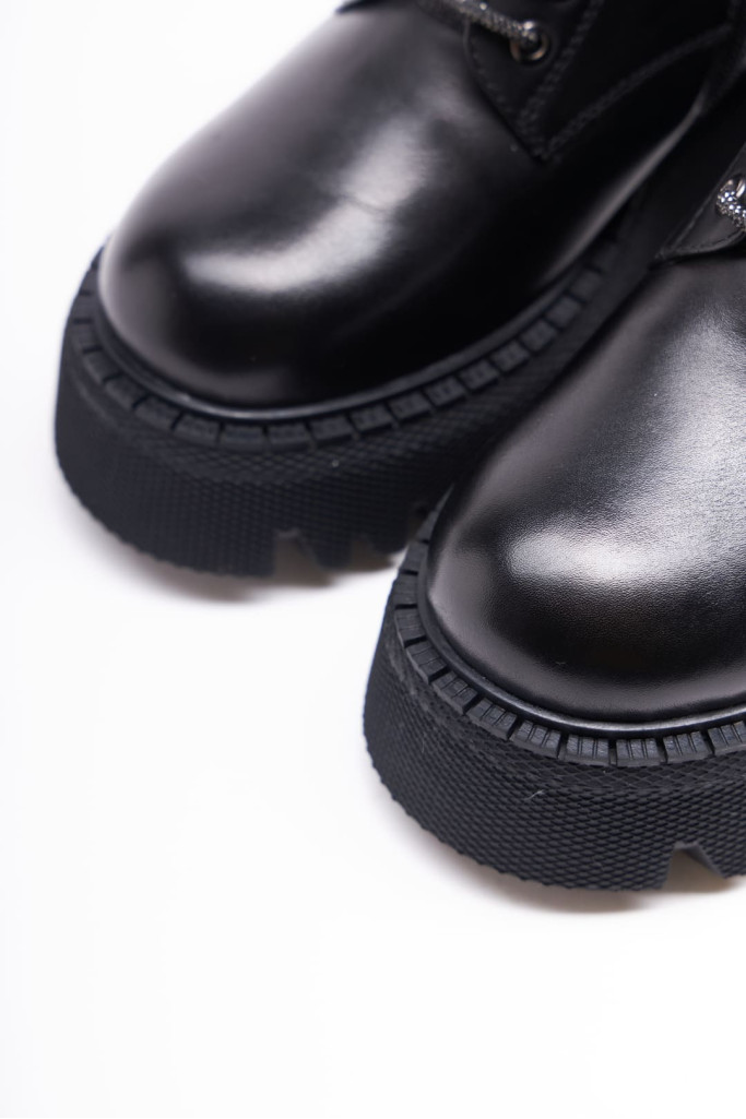Ботинки 1011 представлены в натуральной коже черного цвета. Их главная особенность - закругленный мыс, шнуровка со стразами и массивная подошва, высота которой - 6 см.