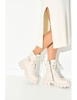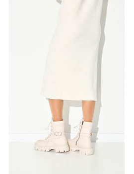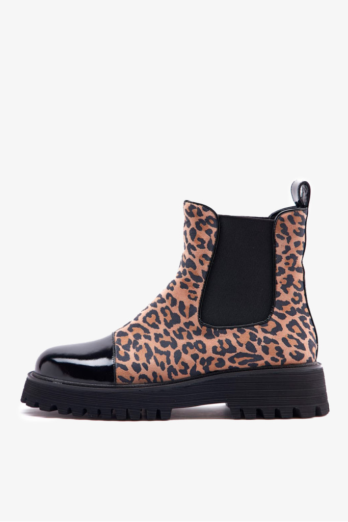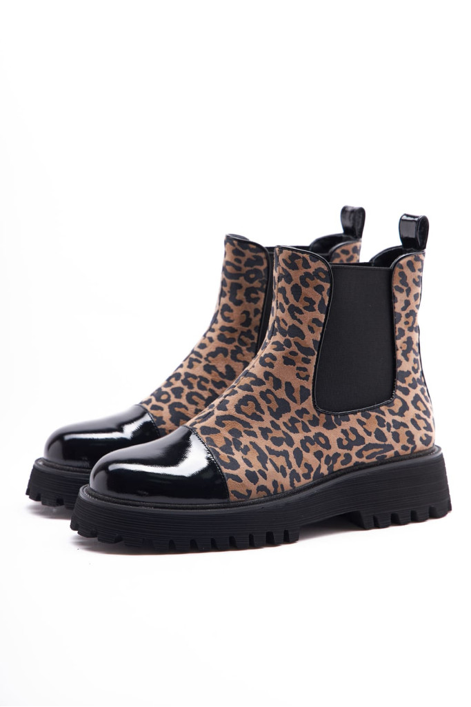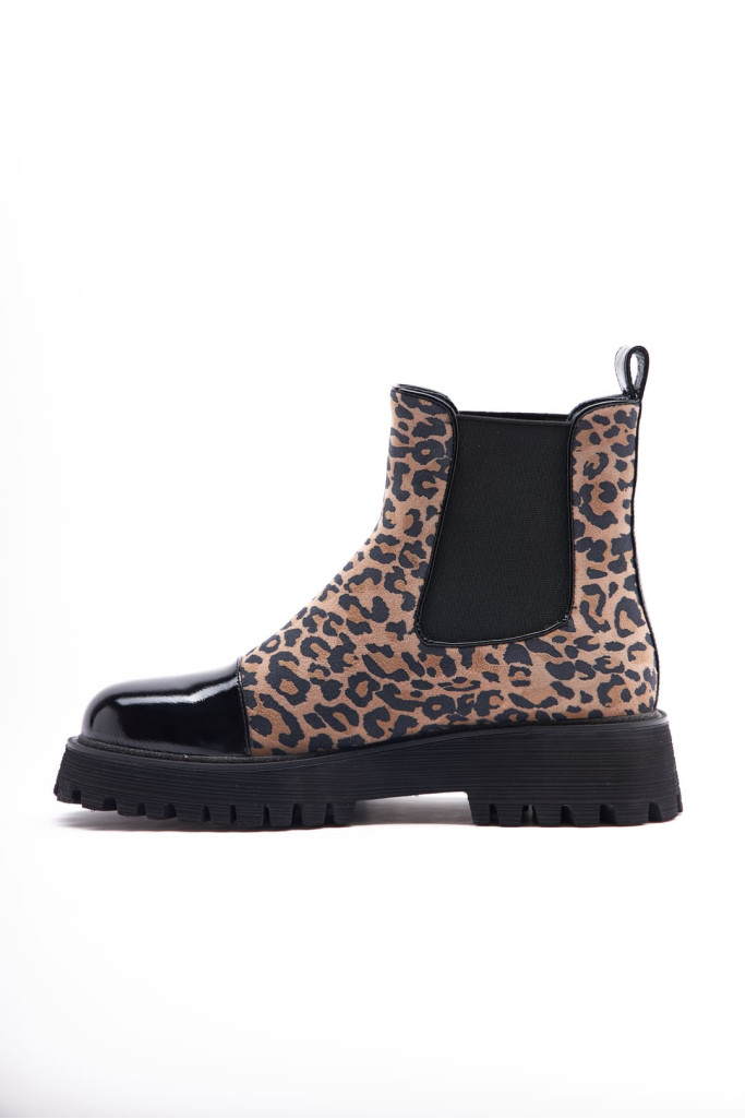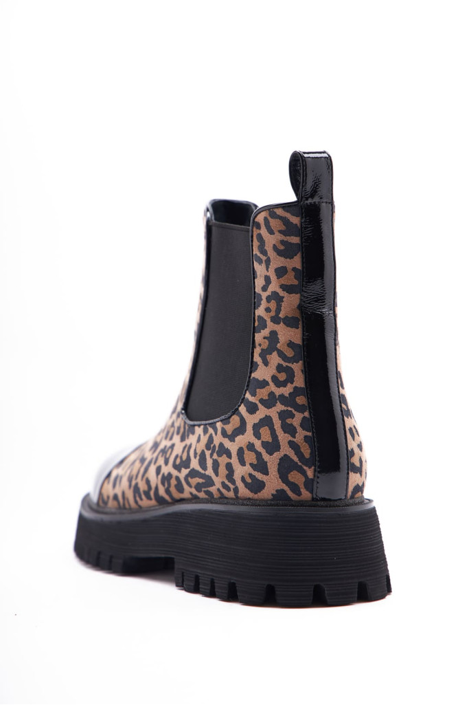 Ботинки 1159 представлены в натуральной замше бежевого цвета. Особенностью этих ботинок является леопардовый принт, эластичные вставки и декоративные вставки из лаковой кожи в носочной части. Это придает им стильный и модный вид.