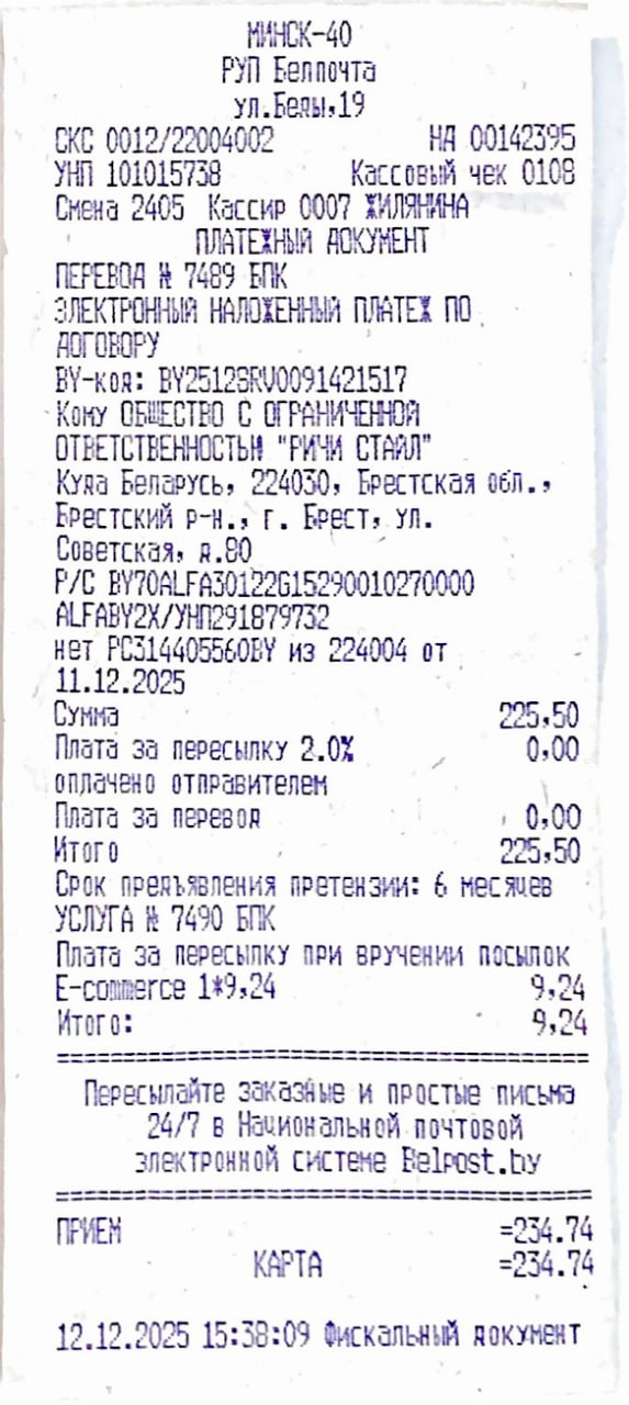 • Стоимость доставки от 10 до 19 BYN в зависимости от веса посылки.